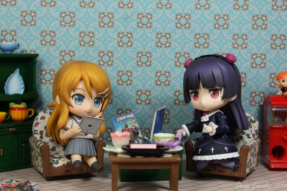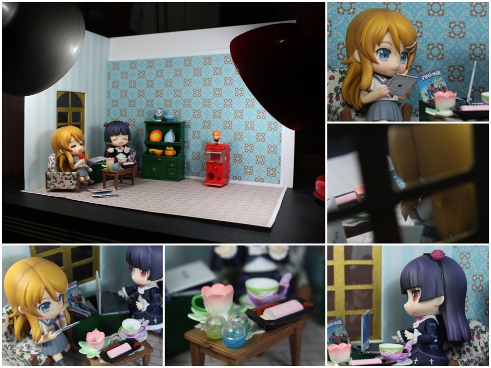 I used Sylvannian Families furniture, DIY background (printable wallpapers, floor and window made by my brother), papercraft Ipad and Laptop and tea sets with cake from Re-ment. I got that toy capsule from my friend. It’s actually One Piece character Nami.