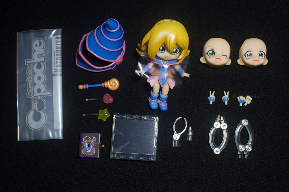 Cu-Poche Dark Magician Girl has 3 face plates including smile, wink and panic expression. It also includes a magical spell book, 2 effect parts (star and heart), wand and 4 optional hand parts.  Magnetic base, posable stand set and a ziplock are also included. The hat is heavy because of a magnet implanted inside it and DMG’s head.